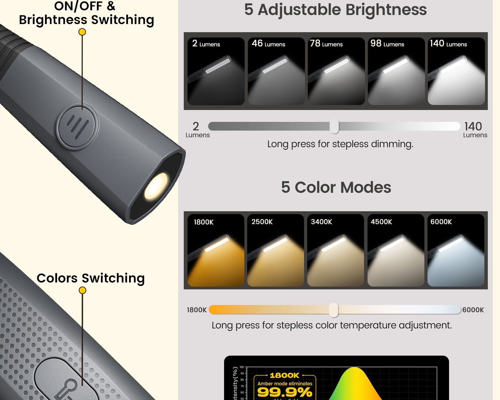I love this for working on small projects or cars. There are 3 different type of light outputs white,blue, and yellow. I like using this when I do some soldering, but would be great for reading in the dark. Only thing is that it's a bit bigger than expected. I wish it more adjustable. If you have a small neck, it may not fit.