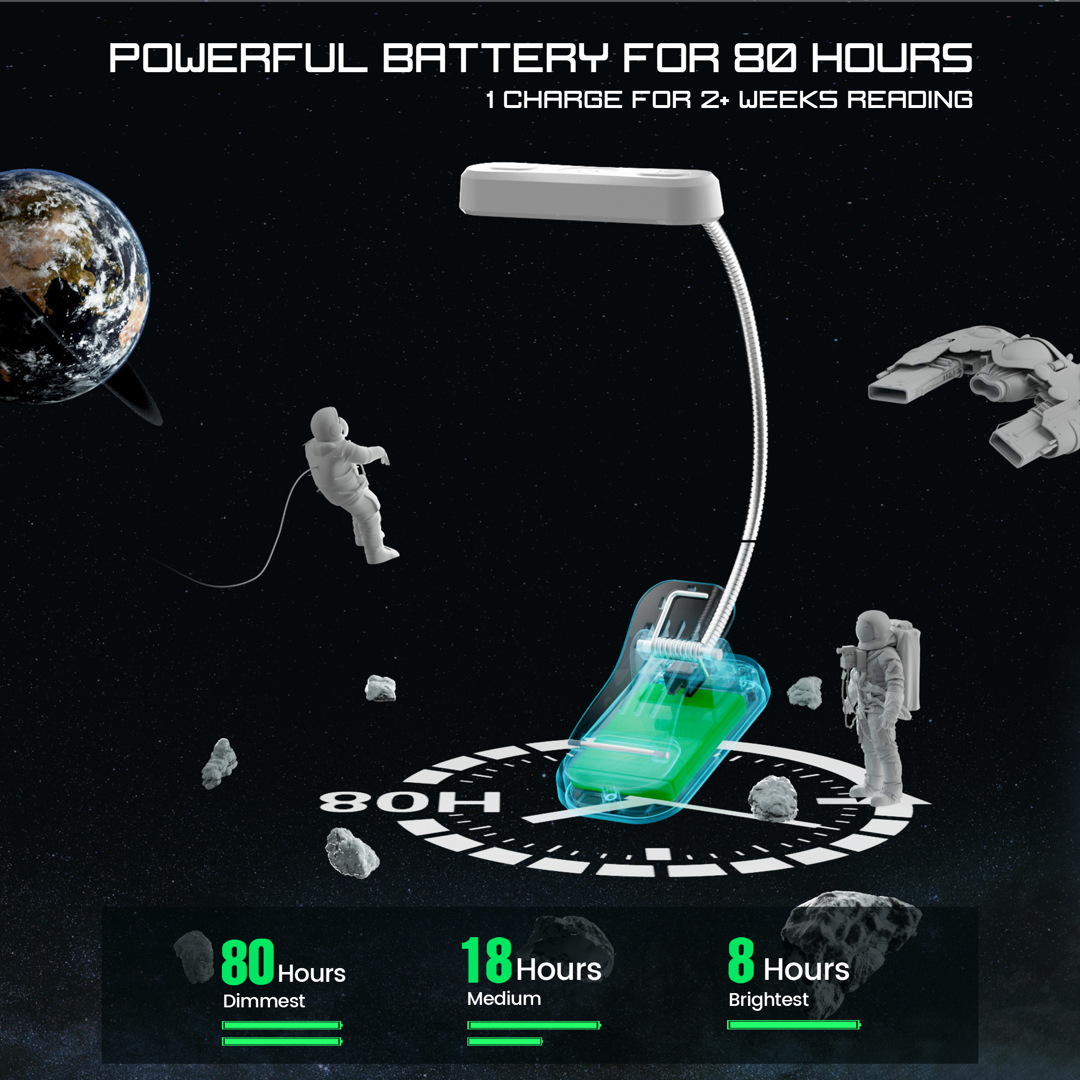 You wished for a lightweight book light with a wider lighting area, and we listened. This horizontal head book light is designed to provide clear and eye-caring broader lighting. Interestingly, we found that the 3 buttons on the light bar look like an ET face, then we named it a horizontal ET head book light. Plus, it's compact to be carried around and improves your reading comfort when reading during your trip, camping, in bed, and more. Here are the 7 special designs that make it your must-own: