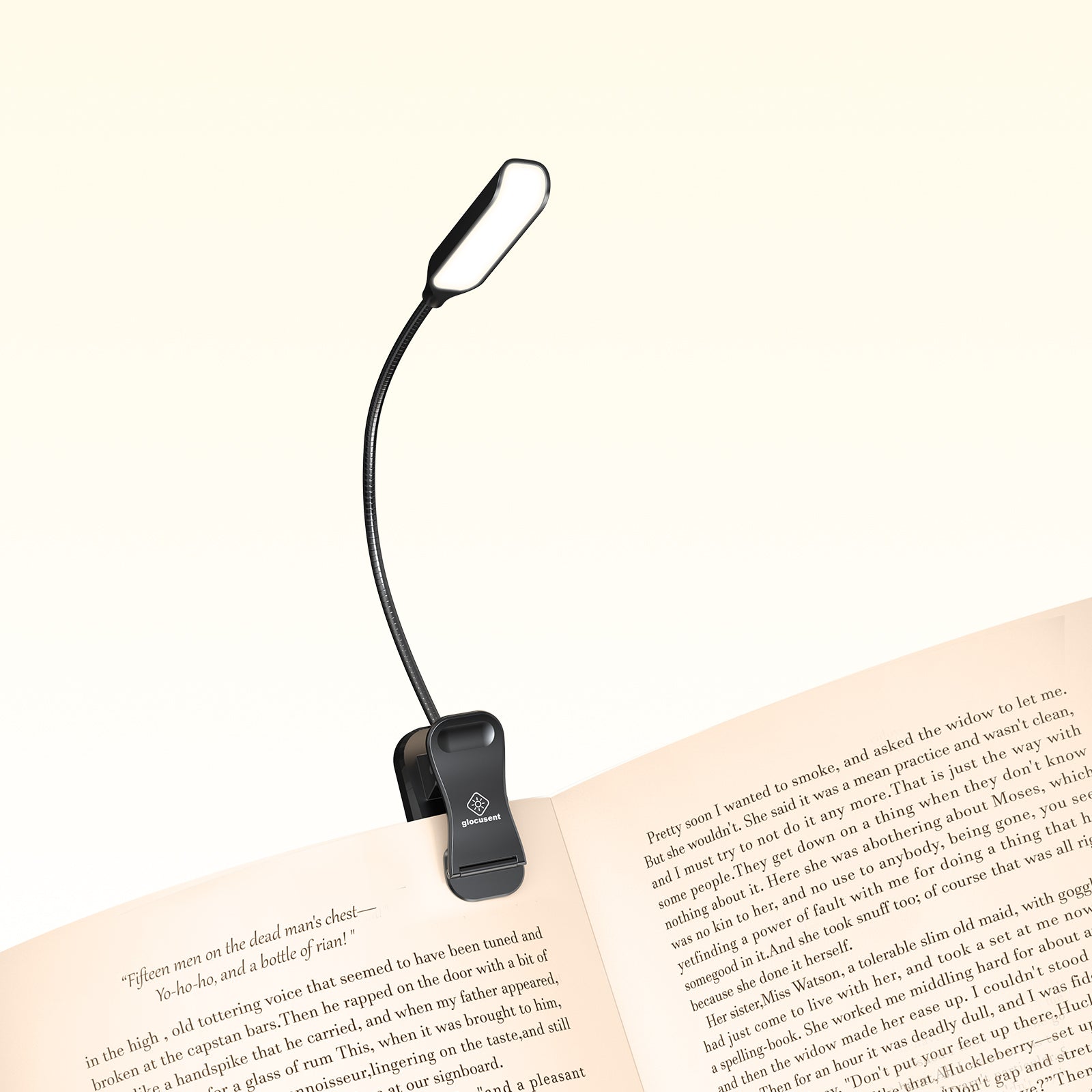 - [SUPER LIGHTWEIGHT & CLIP-ON DESIGN] 1.4oz ONLY. The lightweight and compact book lamp only need a little space to easily carry around. The clamp opens about 1.6 inches and clips on books or ebooks perfectly and tightly. The clip can be opened wide enough to be fixed in various objects. Anti-slippery pads protect your beloved books from being scratched or pinched. It can also stand on your table or desk. Very convenient.