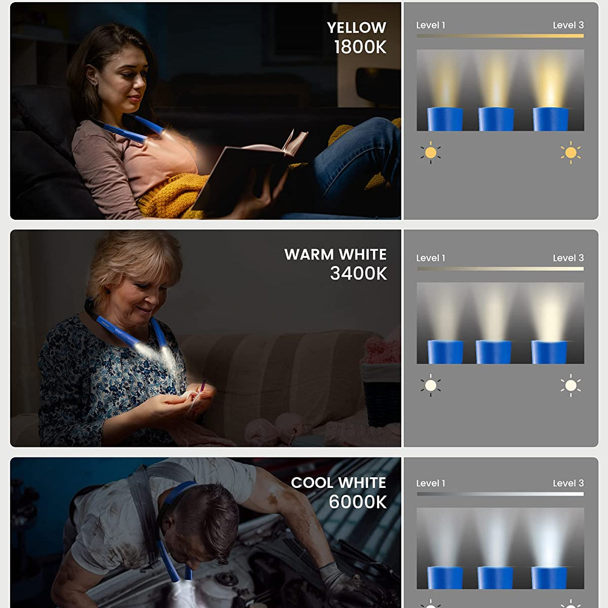 - [Upgraded Innovative Design] Breakthrough refinements based on our customer feedback from the first-generation neck book light. In comparison with the previous one, this neck light narrowed the width of the neck area to fit your neck more comfortably and get more steady, extended the length of the 2 flexible arms for easier operation and to hold the position more stable, and reduced the weight to reduce your fatigue after a long time reading and knitting. Perfect for book lovers and knitters.