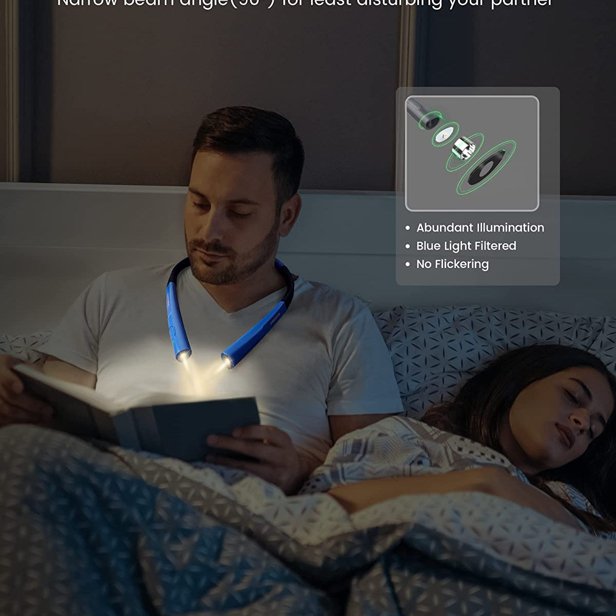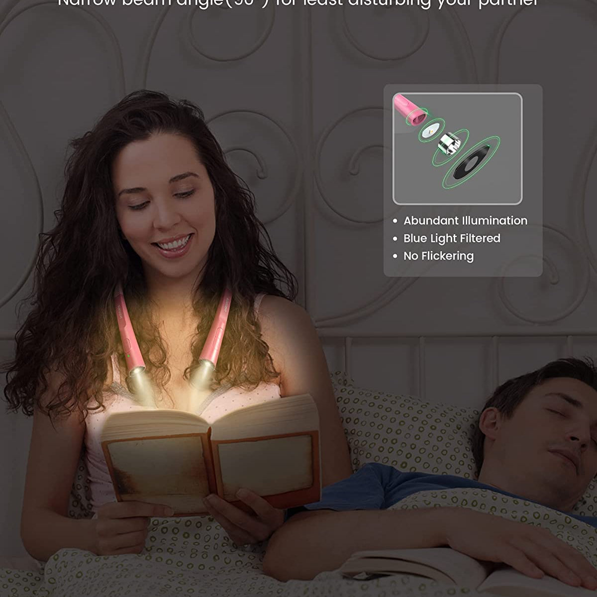 - [Upgraded Innovative Design] Breakthrough refinements based on our customer feedback from the first generation neck book light. In comparison with the previous one, this neck light narrowed the width of the neck area to fit your neck more comfortably and get more steady, extended the length of the 2 flexible arms for easier operation and to hold the position more stable, reduced the weight to reduce your fatigue after long time reading and knitting. Perfect for book lovers and knitters.