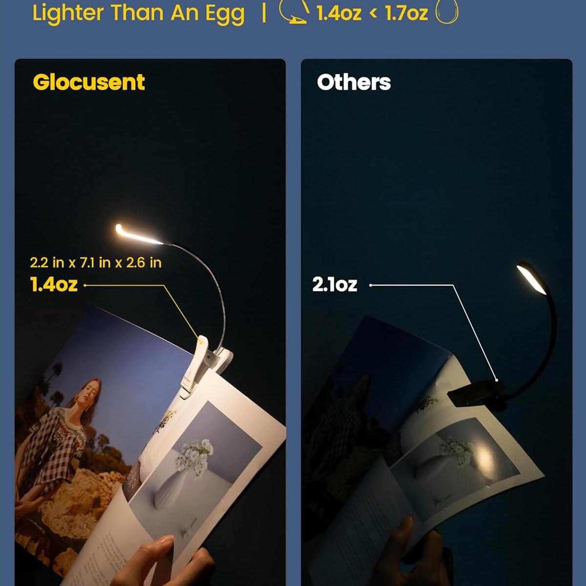 - [SUPER LIGHTWEIGHT & CLIP-ON DESIGN] 1.4oz ONLY. The lightweight and compact book lamp only need a little space to easily carry around. The clamp opens about 1.6 inches and clips on books or ebooks perfectly and tightly. The clip can be opened wide enough to be fixed in various objects. Anti-slippery pads protect your beloved books from being scratched or pinched. It can also stand on your table or desk. Very convenient.