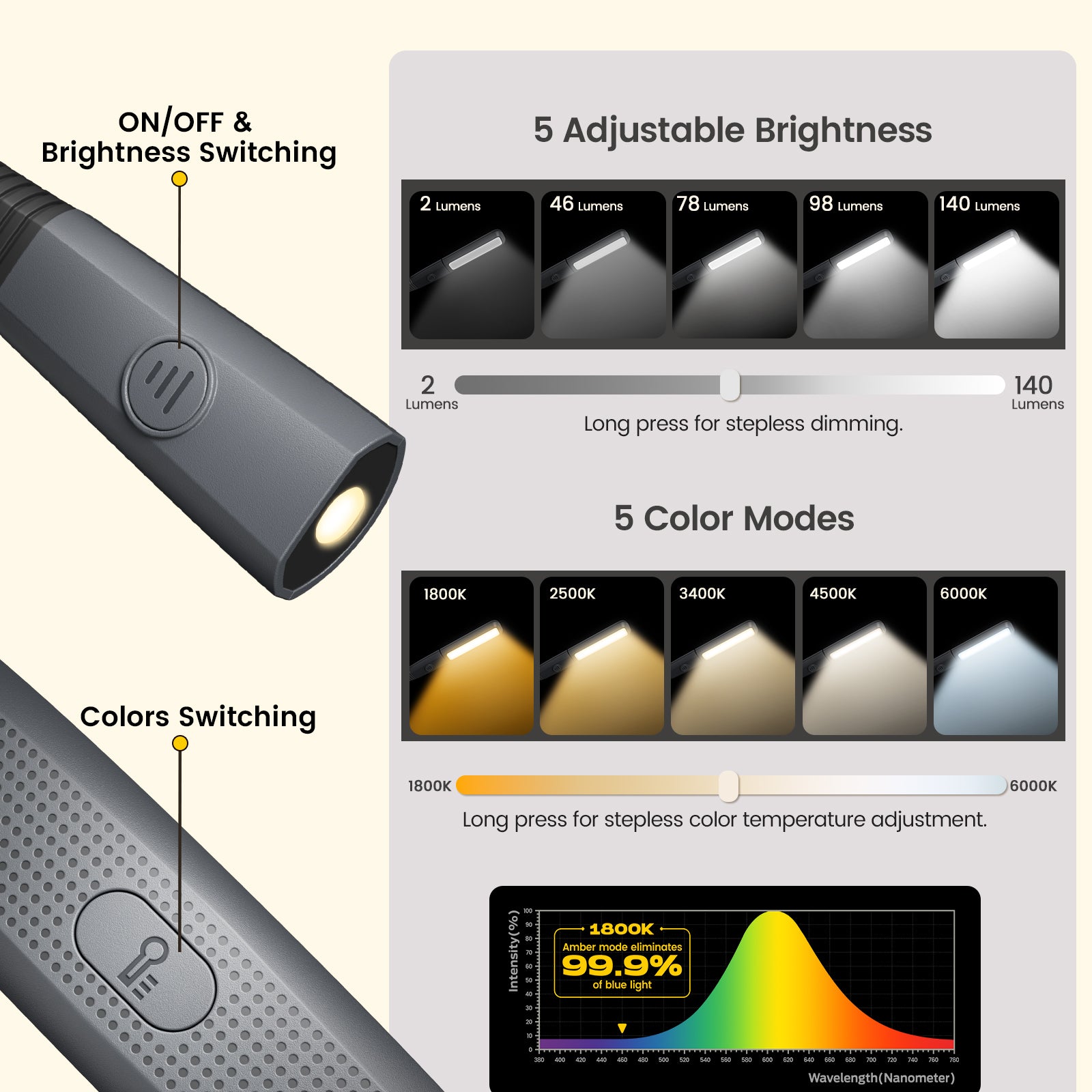 - [5 Brightness Levels & 5 Color Modes] Short press the color temperature button to cycle through 5 colors (1800K-6000K) and press the brightness button to change 5 brightness levels. Stepless adjustment with a long press of the buttons, allowing you to fine-tune the bed reading light to any level for ultimate customization.