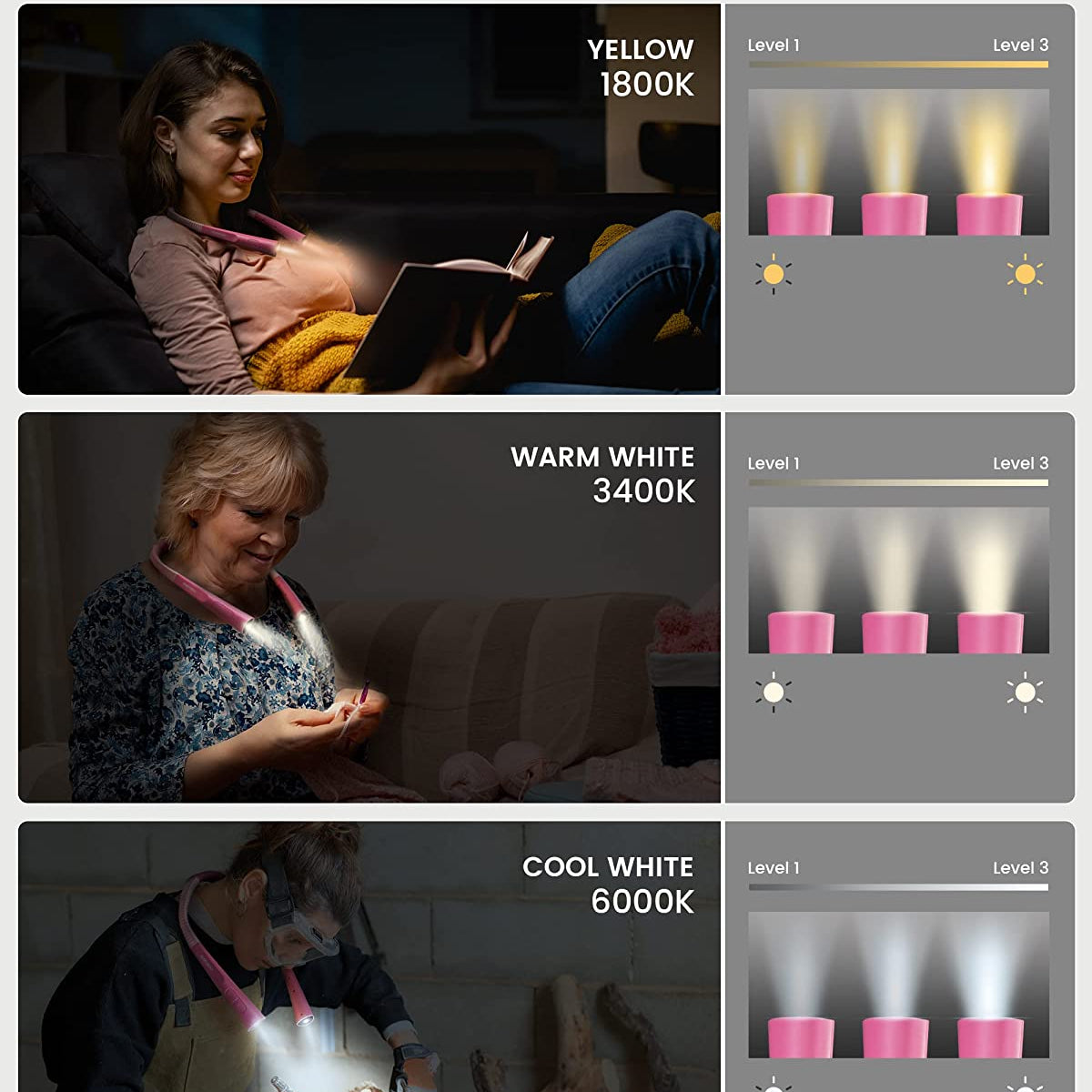 - [Upgraded Innovative Design] Breakthrough refinements based on our customer feedback from the first generation neck book light. In comparison with the previous one, this neck light narrowed the width of the neck area to fit your neck more comfortably and get more steady, extended the length of the 2 flexible arms for easier operation and to hold the position more stable, reduced the weight to reduce your fatigue after long time reading and knitting. Perfect for book lovers and knitters.