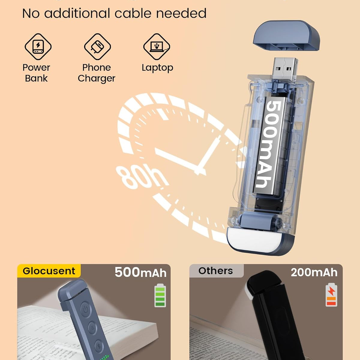 - [USB Rechargeable & Long Lasting] Standard USB rechargeable and compatible with any USB ports on your computer, adapter, or USB outlet. The built-in 500mAh battery provides you with 10 – 80 reading hours (depending on your brightness setting). It means you can enjoy your reading for 20 days to 3 months if you read 30 minutes per day, based on your setting. In addition, there are 4 power indicators to show you the power leftover.